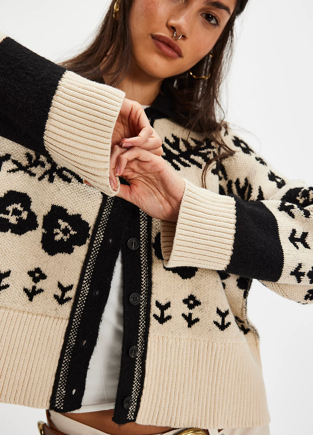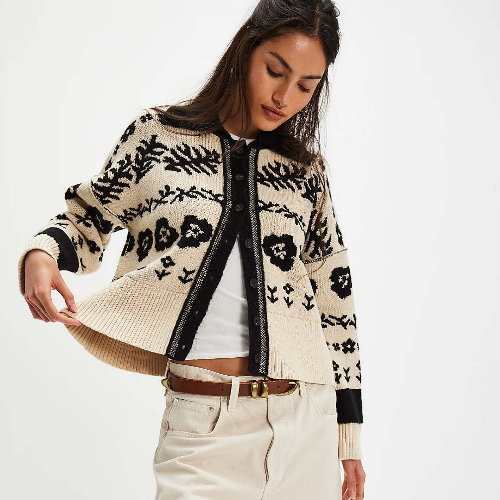 Embrace comfort and style with the Cozy Floral Cardigan by Free People, your new go-to layering piece for any season. Made from a soft cotton knit, this charming cardigan features a delightful floral print that adds a touch of femininity to your everyday wardrobe. The collared neckline and button-front closure provide both warmth and versatility, making it perfect for dressing up or down. With dropped shoulders and ribbed trim, this cardigan is designed for a relaxed fit that flatters all body types.